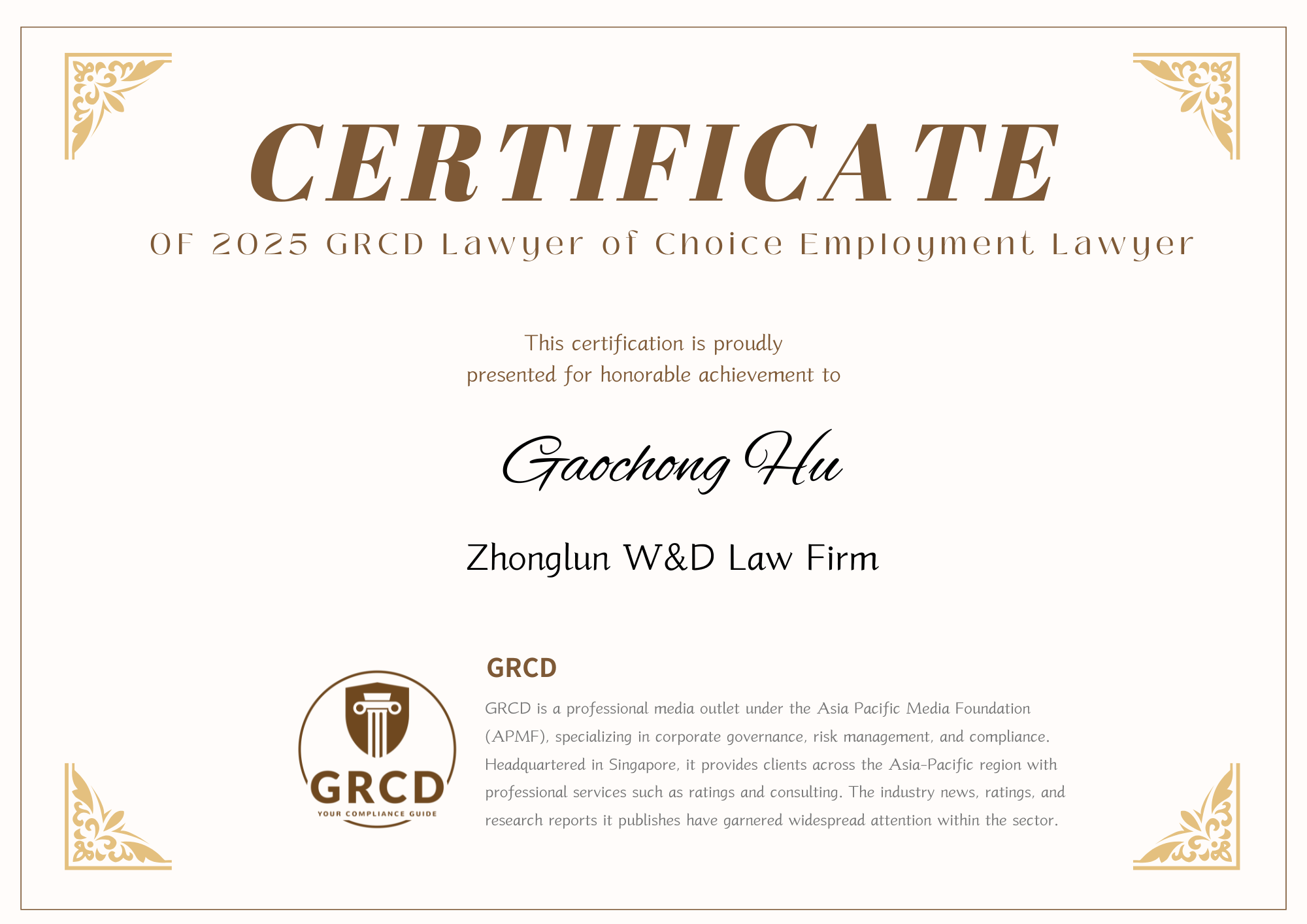 2025年4月23日,基于对中国法律服务市场的跟踪与调研,并经Asia Pacifc Media Foundation核准,国际知名媒体GRCD正式公布“2025年GRCD中国客户首选劳动法律师15强”的最终获奖名单。中伦文德律师事务所执委、高级合伙人胡高崇律师凭借在劳动法领域的专业积淀、卓越业绩,荣登榜单。
