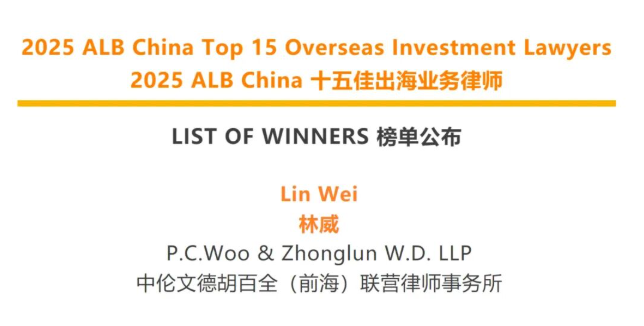 随着“一带一路”倡议迈入新十年,中国企业出海已从‘可选项’升级为‘必选项’。2025年2月20日,《亚洲法律杂志》(Asian Legal Business, ALB)首次发布了“2025 ALB China十五佳出海业务律师(2025 ALB China Top 15 Overseas Investment Lawyers)榜单”,中伦文德胡百全(前海)联营所主任林威博士凭借卓越的专业表现,荣登榜单。