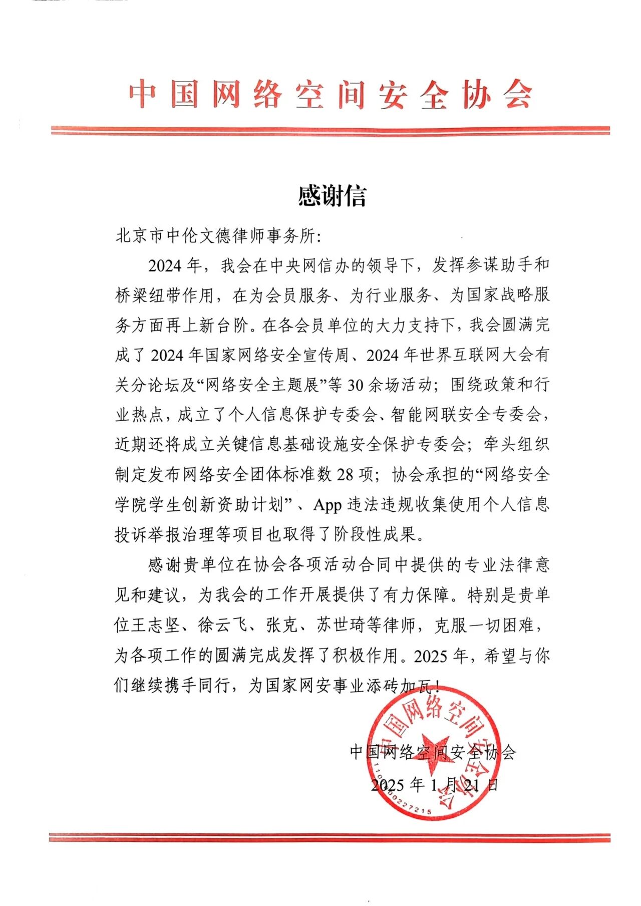 此次获感谢信,不仅是对徐云飞、王志坚、张克、苏世琦等律师专业能力的高度肯定,也是中伦文德律师事务所长期以来秉持专业、专注服务理念的生动体现。一直以来,中伦文德律所致力于为各类客户提供优质法律服务,在多个领域展现出卓越的专业水准。此次在网络空间安全领域获得权威协会认可,无疑为律所品牌形象增添了亮丽一笔,也将激励律所继续深耕专业领域,为更多客户和行业提供坚实法律保障。2025年,中伦文德将继续为广大客户提供优质高效的专业法律服务,创造更多辉煌!