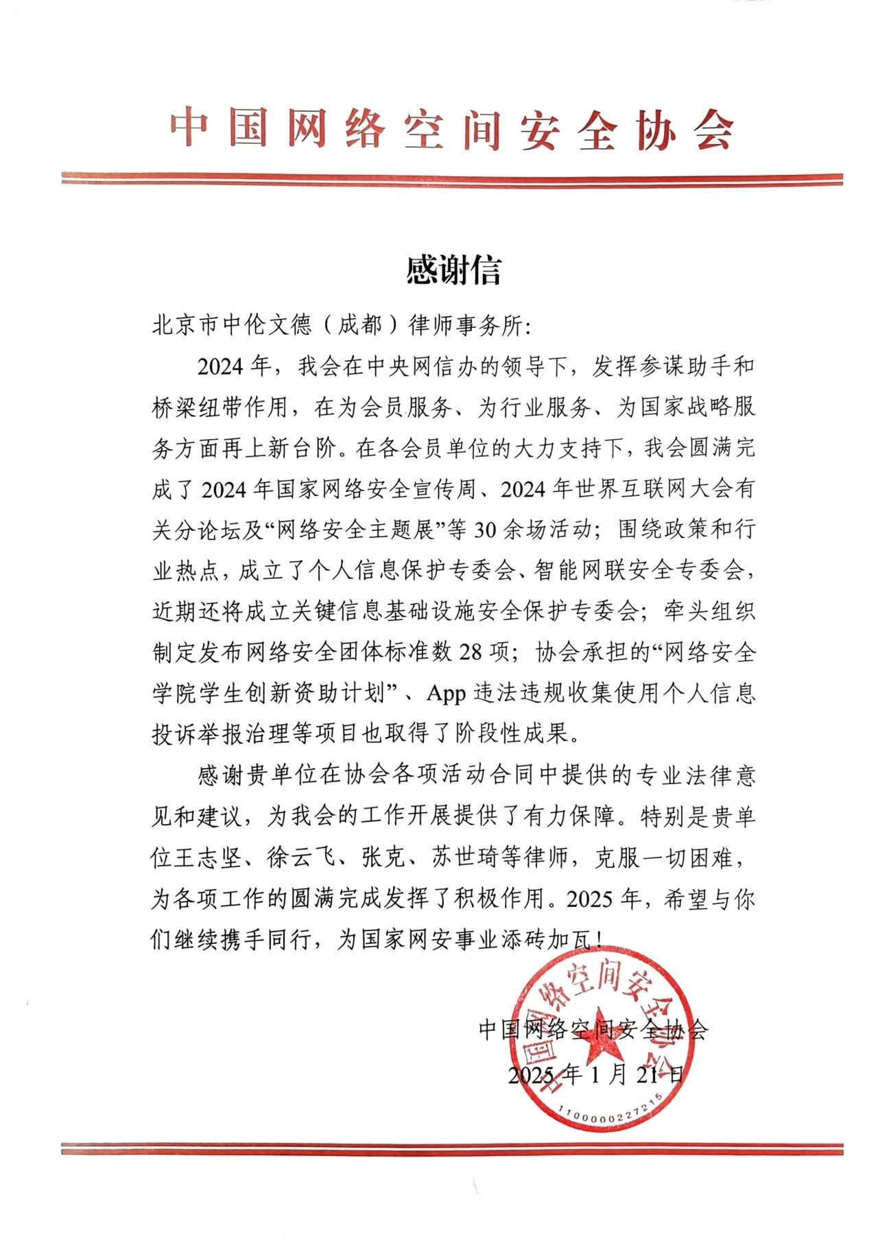 2025年1月21日,中伦文德北京总所及成都分所收到来自中国网络空间安全协会的感谢信。信中,协会对北京总所合伙人徐云飞律师团队及成都分所主任王志坚律师团队在过去一年里为协会各项活动合同所提供的专业法律支持,表达了诚挚的感谢。