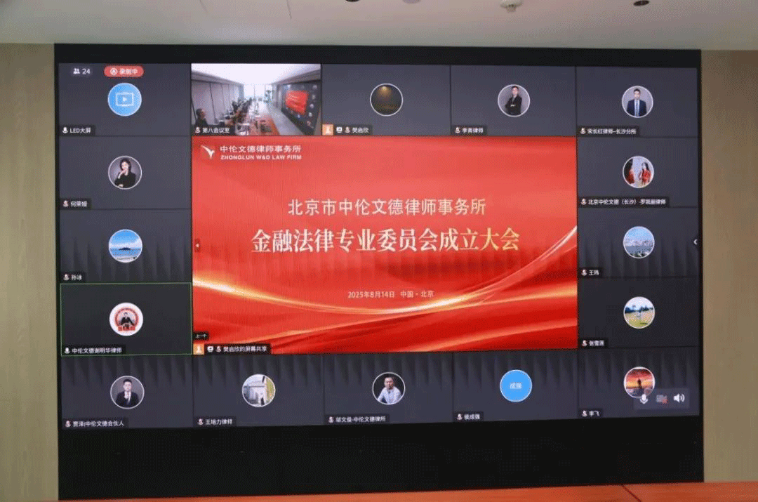 2025年8月14日下午,北京市中伦文德律师事务所金融法律专业委员会(以下简称“专委会”)成立大会在北京总所第八会议室举行,并通过线下、线上相结合的方式实现总所与分所联动。本次专委会成立大会由重庆分所主任谢明华律师主持,中伦文德律师事务所主任夏欲钦律师,天津分所主任、专业化建设分管常务理事温志胜律师,以及来自北京总所和各地分所委员会委员四十余人通过“线上+线下”方式参加了本次会议,共同见证了专委会的正式成立。