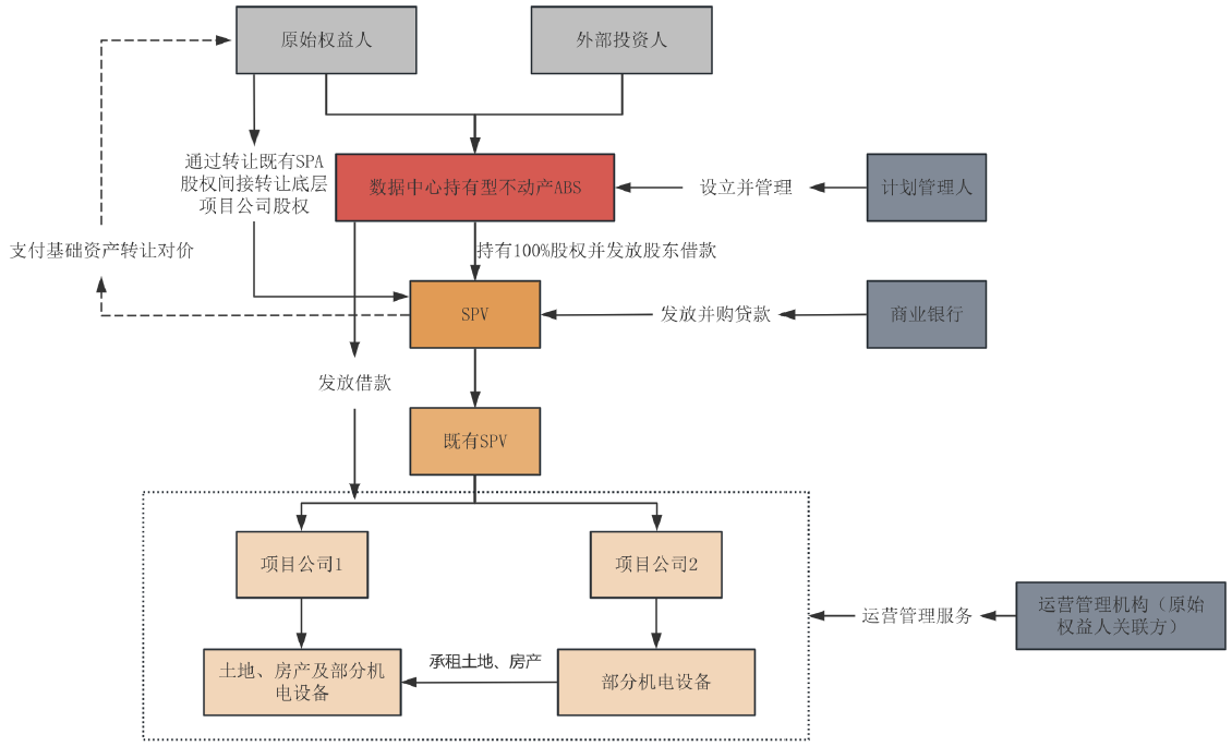 由原始权益人新设SPV,SPV与原始权益人签署相应的股权转让协议,受让并持有既有SPV100%股权,从而间接持有底层两家项目公司100%股权,计划管理人代表专项计划与原始权益人签署新设SPV股权相关的转让协议,由计划管理人代表专项计划受让并间接持有两家项目公司的股权,从而间接持有底层数据中心项目的控制权。